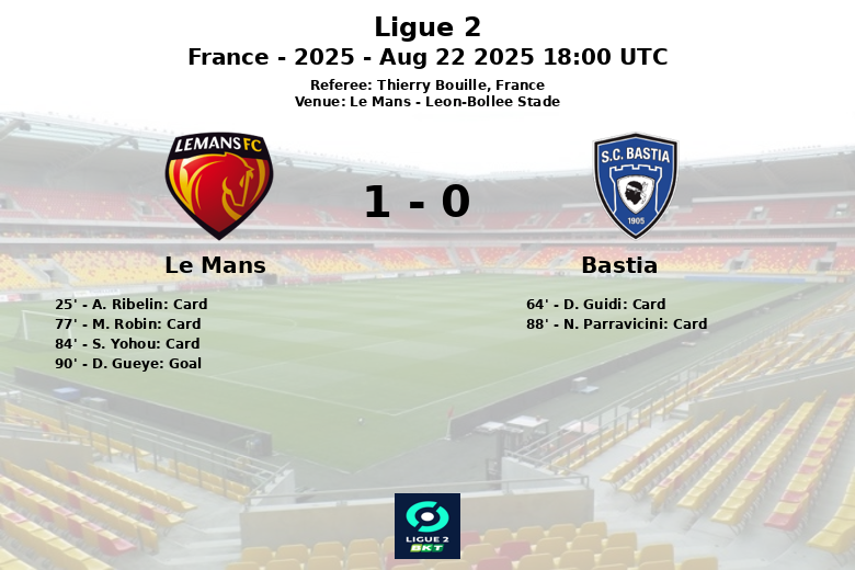 Le Mans et Bastia ont offert une rencontre serrée au Leon-Bollee Stade, correspondant à la troisième journée de la Ligue 2. Le match, disputé au Mans sous le regard attentif de l’arbitre Thierry Bouille, s’est soldé par un match nul, marqué par l’intensité au milieu de terrain et la lutte pour la possession du ballon.