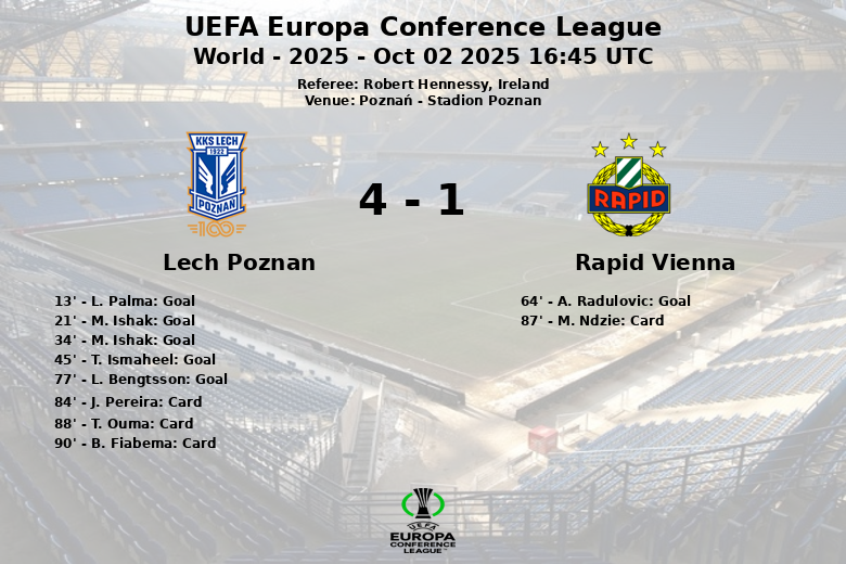 Poznań, Pologne – Le Lech Poznan a dominé le Rapid Vienne lors d’un match vibrant de l’UEFA Europa Conference League. Dès le début, l’équipe locale a démontré sa supériorité, ouvrant le score à la 13e minute grâce à un but de L. Palma. M. Ishak a amplifié l’avance avec un doublé, marquant le deuxième but à la 21e minute, également servi par Palma, bien qu’il ait manqué un penalty à la 34e minute. Avant la mi-temps, T. Ismaheel a porté le score à 3-0 à la 45e minute, avec Palma à nouveau comme passeur décisif.