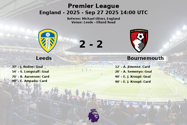 Leeds, Angleterre – Dans un match passionnant correspondant à la sixième journée de Premier League, Leeds United et Bournemouth ont fait match nul deux partout à Elland Road. La rencontre, disputée sous l’œil attentif de l’arbitre Michael Oliver, a été marquée par l’intensité et les rebondissements au score.