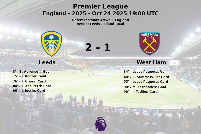 West Ham a tenté de réagir, mais un but de Lucas Paqueta a été refusé pour hors-jeu à la 34e minute, frustrant leurs efforts. Le match est devenu plus tendu, avec plusieurs cartons jaunes distribués aux deux équipes, dont un à C. Summerville de West Ham à la 40e minute et à I. Gruev et Lucas Perri de Leeds en seconde période.