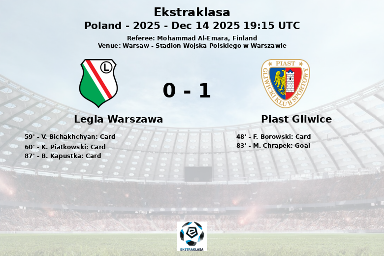 L’unique but du match est survenu à la 83e minute, lorsque M. Chrapek du Piast Gliwice a trouvé le chemin des filets, assurant les trois points à l’équipe visiteuse. Le match a également été marqué par plusieurs cartons jaunes, dont trois pour le Legia Warszawa (V. Bichakhchyan, K. Piatkowski et B. Kapustka) et un pour le Piast Gliwice (F. Borowski). Les deux équipes ont commis 14 fautes, soulignant la bataille au milieu de terrain. L’arbitre finlandais Mohammad Al-Emara a eu fort à faire pour maintenir le contrôle du match.