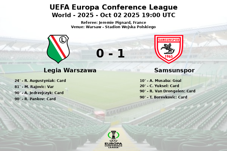 Le match a également été marqué par les cartons. C. Yuksel de Samsunspor et R. Augustyniak du Legia Varsovie ont été avertis en première mi-temps. Dans les dernières minutes, l’arbitre Jeremie Pignard a montré des cartons jaunes à A. Jedrzejczyk, R. Van Drongelen, R. Pankov et T. Borevkovic, reflétant la tension de la rencontre. Malgré la domination territoriale du Legia et ses sept corners, Samsunspor a su gérer le temps et assurer une précieuse victoire à l’extérieur.