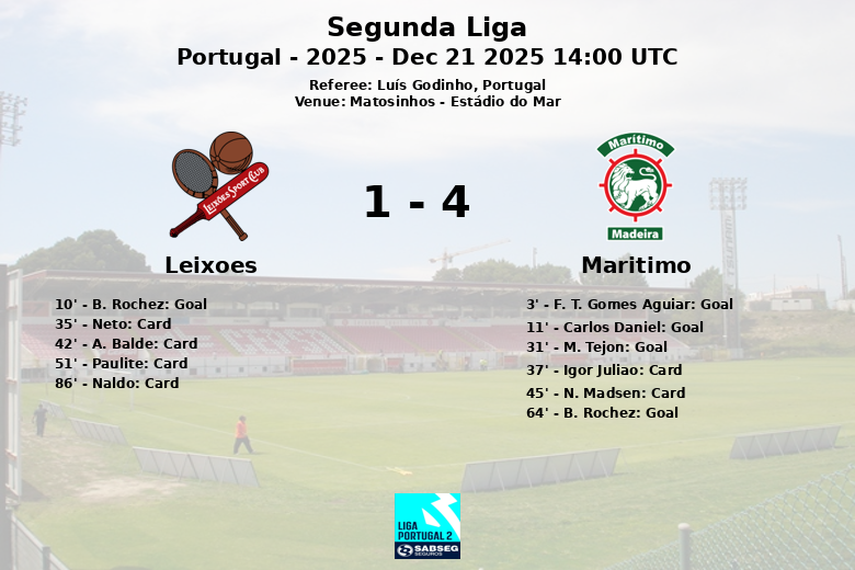 La seconde mi-temps du match n’a pas été moins excitante. À la 64e minute, un but contre son camp de B. Rochez a encore accru l’avantage de Marítimo. Le match a également été marqué par l’intensité et les cartons jaunes. Leixões a reçu quatre cartons (Neto, A. Balde, Paulite et Naldo) tandis que Marítimo a reçu deux cartons (Igor Juliao et N. Madsen). L’arbitre Luís Godinho a officié le match lors de la 15e journée de la deuxième ligue portugaise.