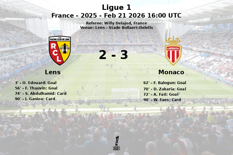 En seconde période, Lens a creusé l’écart avec un but de F. Thauvin à la 56e minute. Cependant, Monaco a réagi avec une remontée impressionnante. F. Balogun a réduit l’écart à la 62e minute, sur une passe décisive de M. Coulibaly, lançant une avalanche de buts. D. Zakaria a égalisé à la 70e minute, sur une passe décisive de Caio Henrique, et A. Fati a donné l’avantage à Monaco à la 72e minute.