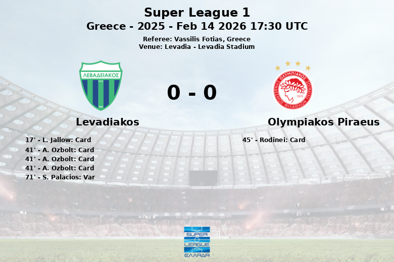 L’arbitre Vassilis Fotias a montré un total de 4 cartons jaunes (3 pour Levadiakos et 1 pour l’Olympiakos) et un carton rouge direct à A. Ozbolt de Levadiakos. Un but de S. Palacios pour Levadiakos a été refusé via la VAR à la 71e minute, ajoutant encore plus de tension au match. Malgré le fait d’avoir joué à dix pendant la majeure partie du match, Levadiakos a réussi à tenir le match nul. L’Olympiakos a obtenu 8 corners contre seulement 2 pour l’équipe locale. Levadiakos a fait preuve d’une grande force en défense pendant le match et a réussi à maintenir le résultat malgré les assauts des visiteurs.