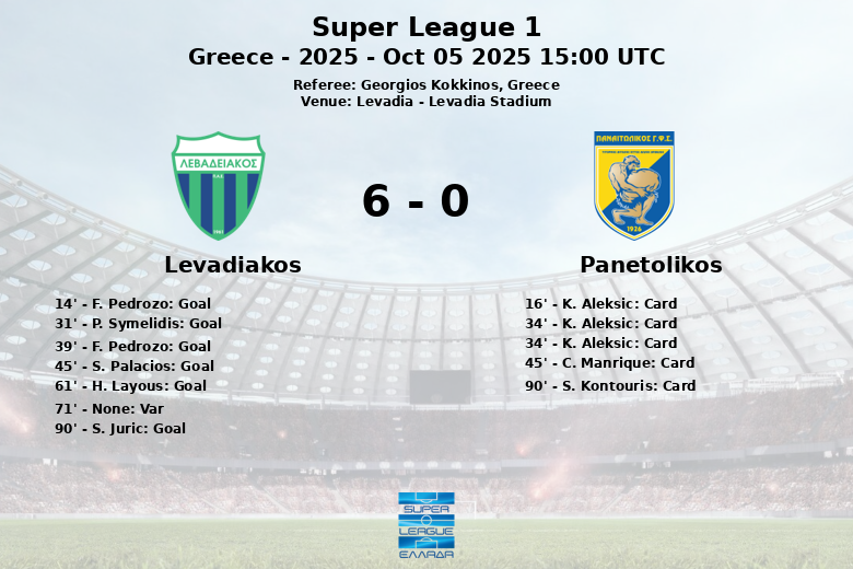 En seconde période, H. Layous a augmenté l’avance à la 61e minute, assisté par S. Palacios. Un but de Levadiakos a été refusé par la VAR à la 71e minute en raison d’une faute. Dans le temps additionnel, S. Juric a clôturé le score avec un autre penalty.