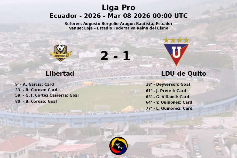 Le match a été marqué par son intensité, reflétée par les six cartons jaunes distribués par l’arbitre Augusto Bergelio Aragon Bautista. LDU de Quito a légèrement contrôlé la possession avec 51% contre 49% pour Libertad. Libertad a dominé au niveau des tirs avec 15, dont 6 cadrés, tandis que LDU de Quito n’a tenté que 7 tirs, dont 2 dirigés vers le but. La rencontre s’est terminée par un partage des points lors de la troisième journée de la Liga Pro 2026.