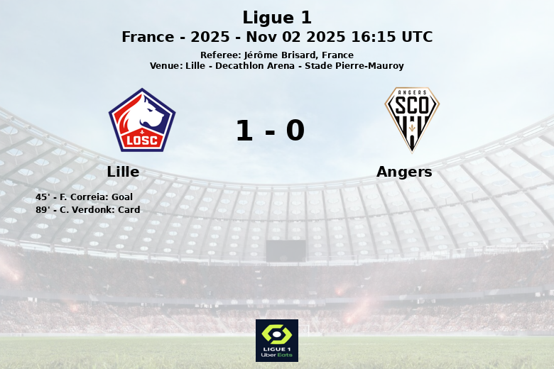 Lille, France – Lille a remporté la victoire face à Angers lors d’un match comptant pour la 11ème journée de Ligue 1, disputé au Decathlon Arena – Stade Pierre-Mauroy. Le seul but du match a été inscrit à la 45ème minute par F. Correia, sur une passe décisive de A. Bouaddi, donnant ainsi l’avantage définitif à l’équipe locale.