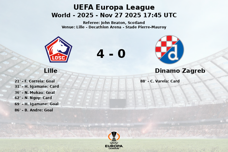 H. Igamane s’est joint à la fête des buts à la 69e minute, encore une fois sur une passe de H. Haraldsson. Pour sceller la victoire, B. Andre a marqué à la 86e minute. Le Dinamo Zagreb, en revanche, a eu du mal à se montrer dangereux, avec seulement trois tirs, dont aucun n’était cadré. C. Varela a reçu un carton jaune à la 88e minute. L’arbitre écossais John Beaton a officié le match. Lille démontre une grande solidité en UEFA Europa League saison 2025.