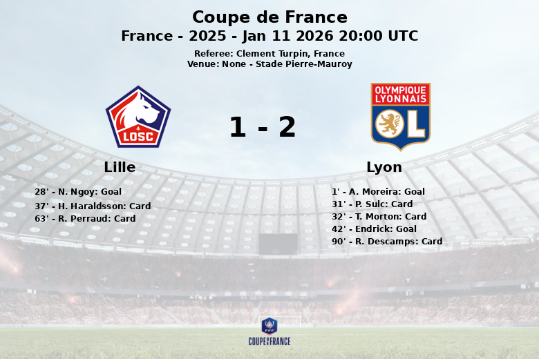 Lors d’un match vibrant disputé au Stade Pierre-Mauroy, Lyon s’est imposé face à Lille sur le score de 2-1, se qualifiant ainsi pour le prochain tour de la Coupe de France. Le match, comptant pour les 32es de finale, était arbitré par Clément Turpin.