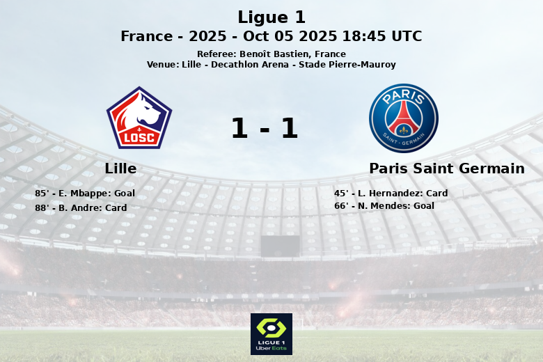 La première mi-temps s’est déroulée sans but, mais avec un carton jaune pour L. Hernandez du PSG à la 45e minute. Le score a été ouvert à la 66e minute avec un but de N. Mendes pour le PSG. Lille a répondu dans les dernières minutes, avec un but de E. Mbappe à la 85e minute, avec une passe décisive de H. Igamane. B. Andre, de Lille, a reçu un carton jaune à la 88e minute.