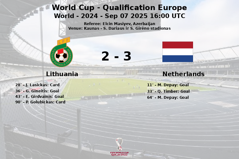 Dans une rencontre palpitante qui s’est déroulée au S. Dariaus ir S. Girėno stadionas de Kaunas, les Pays-Bas ont triomphé de la Lituanie dans un match comptant pour les éliminatoires de la Coupe du Monde – Europe. La domination néerlandaise était évidente dès le début, reflétée par un taux de possession de 77 %. Memphis Depay a ouvert le score pour les visiteurs à la 11e minute avec une belle finition après une passe décisive de Cody Gakpo. Jurriën Timber a porté l’avance à la 33e minute. Cependant, la Lituanie a répondu de manière surprenante avant la mi-temps, avec des buts de Gvidas Gineitis à la 36e minute, sur une passe de Justas Lasickas, et d’Edvinas Girdvainis à la 43e minute, sur une passe de Gineitis lui-même.