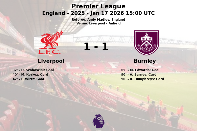 Le score a été ouvert à la 32e minute par un but de D. Szoboszlai. Peu de temps après, à la 42e minute, F. Wirtz a creusé l’écart pour Liverpool, renforçant leur contrôle du jeu. Cependant, Burnley n’a pas abandonné et M. Edwards a réduit le score à la 65e minute, diminuant le déficit et créant une tension dans les dernières étapes du match.