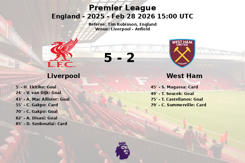 Liverpool, Angleterre – Dans un match électrisant disputé à Anfield, Liverpool a battu West Ham de manière convaincante avec un score final de 5 à 2. Le match, correspondant à la 28e journée de la Premier League 2025, a été un festival de buts et d’émotions.