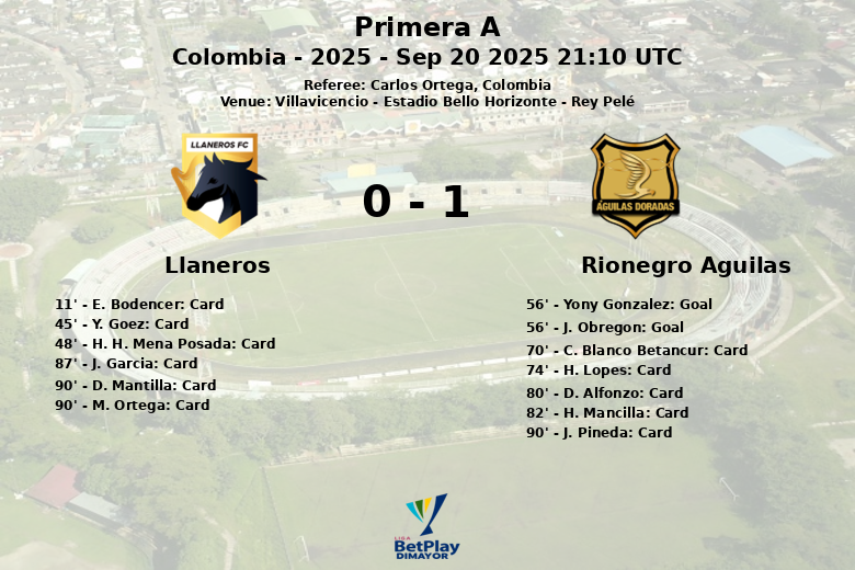 Le score a été ouvert à la 56e minute après que Yony Gonzalez a raté un penalty, mais le jeu a continué et il a aidé J. Obregon, qui a finalement marqué le but qui a donné l’avantage à Rionegro Aguilas. Malgré les efforts de Llaneros pour égaliser, la supériorité numérique de Rionegro Aguilas, renforcée par une défense solide, a prévalu jusqu’au coup de sifflet final. Llaneros a effectué 6 tirs, 3 cadrés et 3 non cadrés, tandis que Rionegro Aguilas a enregistré 10 tirs, 5 cadrés et 5 non cadrés. Le match s’est terminé avec un nombre élevé de fautes commises par les deux équipes, 15 pour Llaneros et 16 pour Rionegro Aguilas.