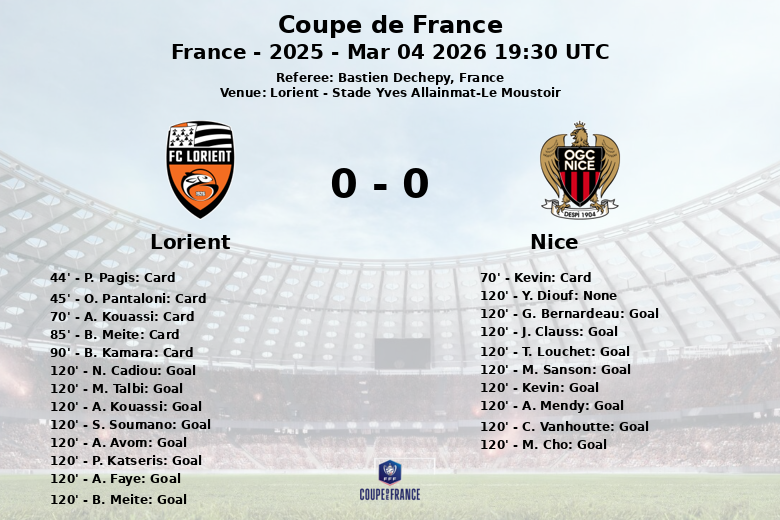 Avec 13 tirs pour Nice et 9 pour Lorient, aucune des deux équipes n’a réussi à envoyer le ballon au fond des filets pendant le temps réglementaire. Nice a obtenu 8 corners contre 0 pour Lorient, mais ils n’ont pas réussi à marquer. Les fautes ont également été nombreuses, avec 16 commises par Nice et 7 par Lorient.