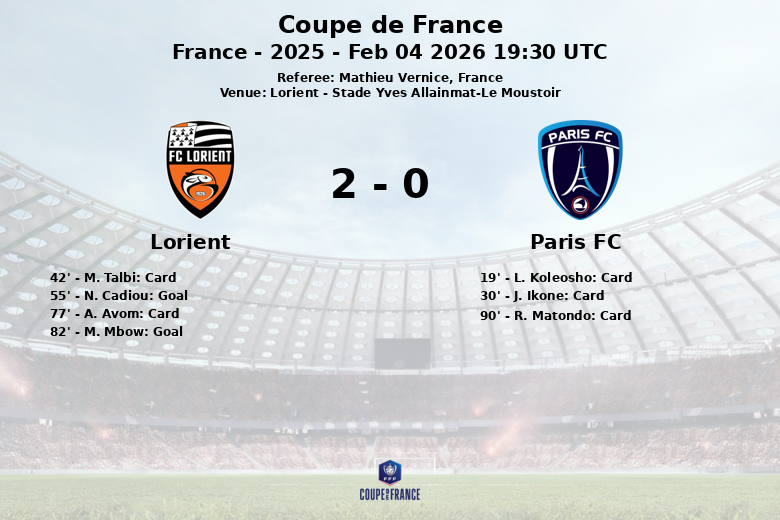 Lorient, France – Dans un match acharné au Stade Yves Allainmat-Le Moustoir, Lorient et le Paris FC ont fait match nul 1-1 lors de leur rencontre des huitièmes de finale de la Coupe de France. Le match, arbitré par Mathieu Vernice, a été caractérisé par l’intensité et une bataille pour le contrôle du ballon.