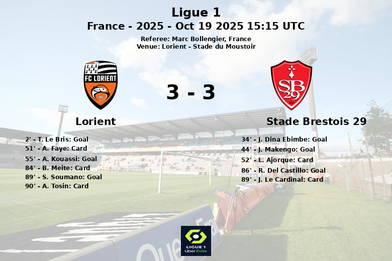En deuxième mi-temps, Lorient est revenu avec une énergie renouvelée. A. Kouassi a égalisé à la 55ème minute, assisté par T. Le Bris. Le match est resté équilibré et tendu, avec plusieurs cartons jaunes distribués aux deux équipes. Dans les dernières minutes, alors qu’il semblait qu’un match nul était inévitable, R. Del Castillo a marqué un penalty pour Brestois à la 86ème minute. Cependant, la joie fut de courte durée, car S. Soumano a scellé la victoire pour Lorient à la 89ème minute, avec une passe décisive de B. Dieng. Le match s’est terminé avec un total de cinq cartons jaunes pour Lorient et deux pour Brestois. En termes de possession, Brestois avait un léger avantage avec 51 % contre 49 % pour Lorient. Lorient a été plus efficace devant le but, avec 7 tirs cadrés sur 12 tentés, tandis que Brestois a réussi 4 tirs cadrés sur 8.
