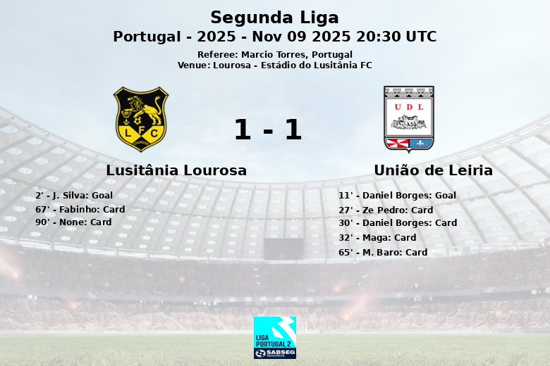 Lourosa, Portugal – Dans une rencontre acharnée au Estádio do Lusitânia FC, Lusitânia Lourosa et União de Leiria ont fait match nul lors d’un match plein d’émotions et de cartons. J. Silva a donné l’avantage à Lusitânia Lourosa à la 2e minute grâce à une passe décisive d’Arsenio, mais la joie locale a été de courte durée puisque Daniel Borges a égalisé pour União de Leiria à la 11e minute grâce à une passe décisive de J. Munoz.