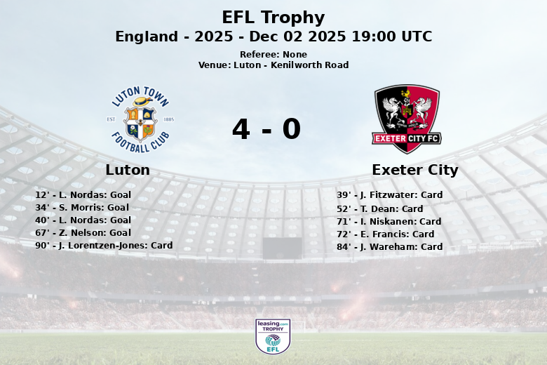 Luton a offert une démonstration de puissance offensive à domicile, battant de manière convaincante Exeter City à Kenilworth Road. Le match, correspondant au tour des 32èmes de finale de l’EFL Trophy, s’est terminé par une nette supériorité de l’équipe locale, qui a dominé la rencontre du début à la fin.