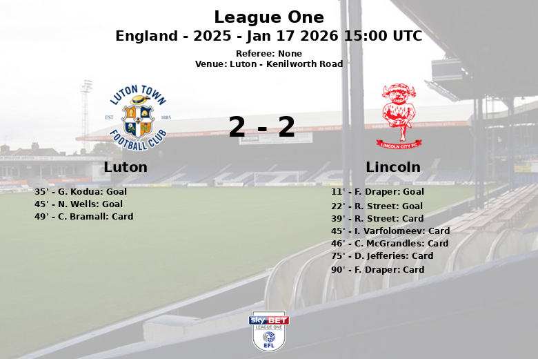 Luton et Lincoln City ont livré un match passionnant à Kenilworth Road qui s’est terminé par un match nul. Lincoln a frappé en premier avec deux buts en première mi-temps, grâce à F. Draper à la 11e minute, passe décisive de J. Moylan, et R. Street à la 22e minute, passe décisive de T. Hamer. Cependant, Luton a répondu avec des buts de G. Kodua à la 35e minute, passe décisive de L. Walsh, et N. Wells juste avant la mi-temps à la 45e minute, passe décisive de K. Naismith, égalisant ainsi le score.