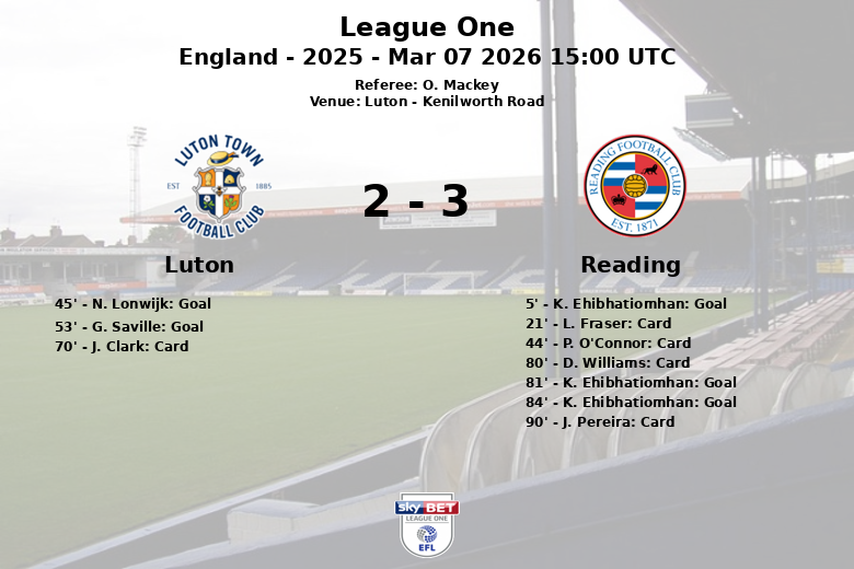 Reading a obtenu une victoire importante à l’extérieur à Kenilworth Road contre Luton, dans un match rempli de rebondissements. Le match de League One, comptant pour la 36e journée, a vu Reading prendre l’avantage dès la 5e minute grâce à un but de K. Ehibhatiomhan. Cependant, Luton a réagi avant la mi-temps avec un but de N. Lonwijk à la 45e minute.