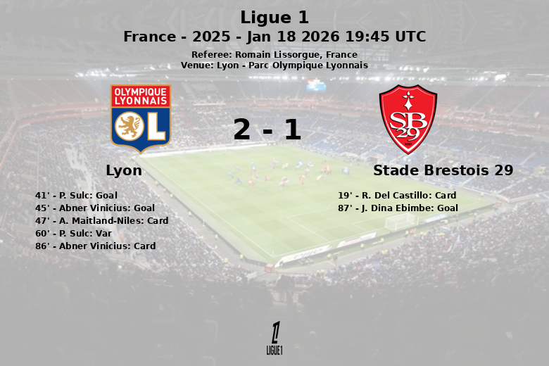 Brest a subi un coup dur dès le début lorsqu’il a été réduit à dix hommes à la 19e minute, suite à l’expulsion de R. Del Castillo avec un carton rouge. Malgré l’infériorité numérique, Brest a lutté avec courage, mais Lyon a profité de sa supériorité. P. Sulc a ouvert le score pour Lyon à la 41e minute, sur une passe décisive de A. Moreira. Juste avant la mi-temps, à la 45e minute, Abner Vinicius a creusé l’écart pour l’équipe locale avec un but sur une passe décisive d’Endrick, consolidant la domination de Lyon.