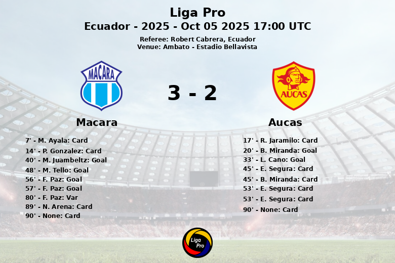 La seconde mi-temps a été un tourbillon. Macará est revenu avec une attitude renouvelée et M. Tello a réduit l’écart à la 48e minute, assisté par le même M. Juambeltz. L’expulsion de E. Segura à la 53e minute après avoir reçu son deuxième carton jaune, a laissé Aucas à dix joueurs. F. Paz a profité de la supériorité numérique et a marqué deux buts consécutifs aux 56e et 57e minutes, inversant le score. Malgré un but refusé à F. Paz pour hors-jeu à la 80e minute, Macará s’est accroché à l’avantage.