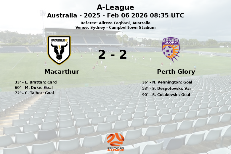 Sydney, Australie – Dans une rencontre animée qui s’est déroulée au Campbelltown Stadium, Macarthur FC a remporté la victoire face à Perth Glory avec un score reflétant l’intensité du match. L’arbitre Alireza Faghani a supervisé un duel où la possession a favorisé l’équipe locale avec 59 %, tandis que Perth Glory en a détenu 41 %.