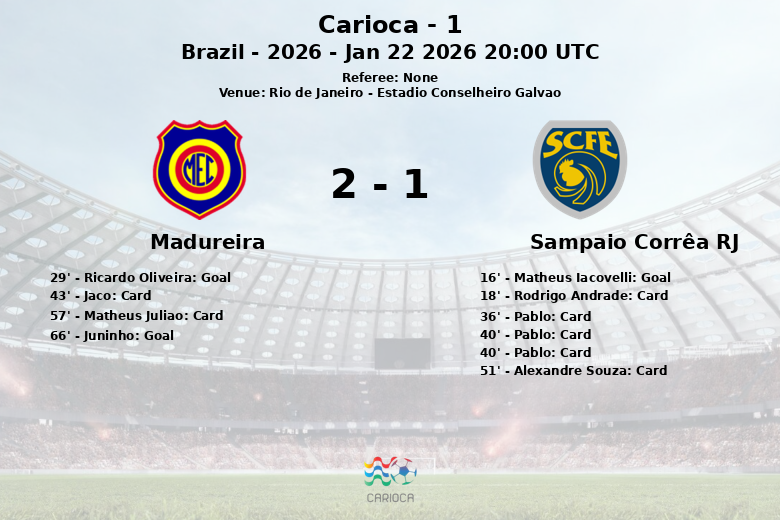 Le match a commencé avec Sampaio Corrêa RJ prenant l’avantage grâce à un but de Matheus Iacovelli à la 16e minute, suite à une passe décisive de Rodrigo Andrade. Cependant, leur joie fut de courte durée puisque Rodrigo Andrade a reçu un carton jaune à peine deux minutes plus tard. Madureira a répondu avec un but de Ricardo Oliveira à la 29e minute, égalisant le score avec une passe de Jean.