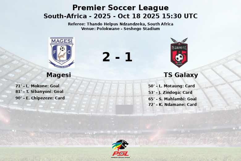 Polokwane, Afrique du Sud – Dans un match vibrant qui s’est déroulé au Seshego Stadium, Magesi a battu TS Galaxy avec un score final de 2 à 1, dans un match correspondant à la dixième journée de la Premier Soccer League. L’équipe locale, avec 52% de possession de balle, a démontré sa capacité à réagir après un but initial de S. Mahlambi pour TS Galaxy à la 65e minute.