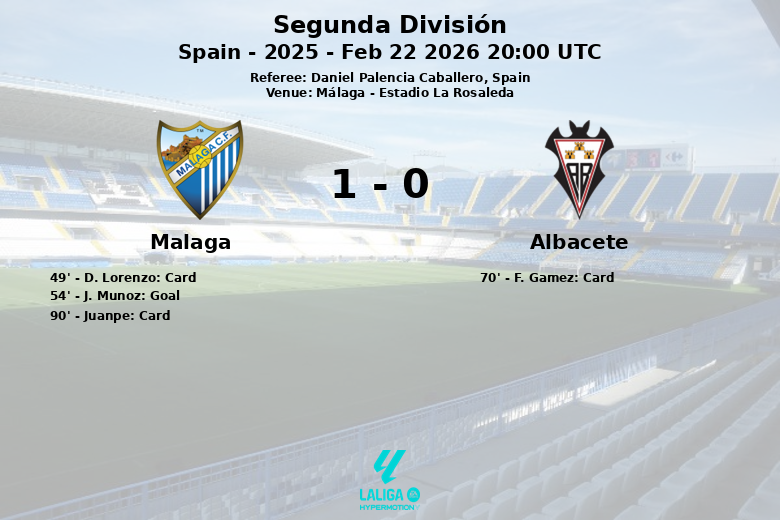 L’arbitre du match, Daniel Palencia Caballero, a averti D. Lorenzo et Juanpe pour Malaga et F. Gamez pour Albacete.