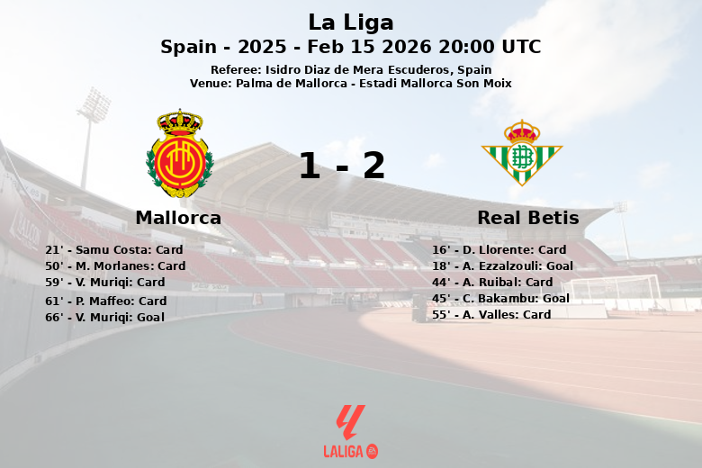Le Real Betis a profité de ses opportunités en première mi-temps, avec des buts de A. Ezzalzouli à la 18e minute, après une action sans passe décisive directe, et de C. Bakambu juste avant la mi-temps, sur une passe d’Antony, pour prendre l’avantage. Majorque, malgré 65 % de possession de balle et 13 tirs, n’a réussi à en convertir qu’un seul, grâce à V. Muriqi à la 66e minute, sur une passe de S. Darder.
