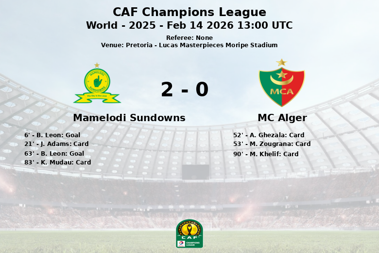 Bien que le MC Alger ait essayé de réagir, il n’a réussi qu’à créer quelques occasions dangereuses sans réellement inquiéter le gardien adverse. La défense de Sundowns est restée solide, empêchant toute tentative de remontée. Le match a également été marqué par son intensité physique, avec plusieurs cartons jaunes distribués aux deux équipes. J. Adams et K. Mudau ont été avertis pour Sundowns, tandis que A. Ghezala, M. Zougrana et M. Khelif ont reçu des cartons pour le MC Alger.