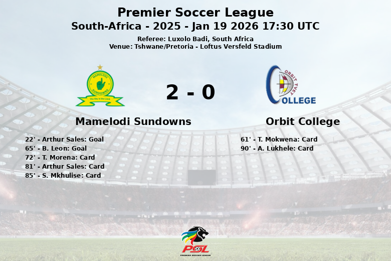 Remplacements dans l’quipe de orbit college: À la 46e minute, I. Ramosala est entré et B. Ralani est sorti., À la 59e minute, C. Chibwe est entré et S. Nkomo est sorti., À la 59e minute, L. Mahlatsi est entré et A. Lukhele est sorti., À la 70e minute, T. Mokwena est entré et P. Mahlangu est sorti., À la 79e minute, L. Modimoeng est entré et S. Mabele est sorti.