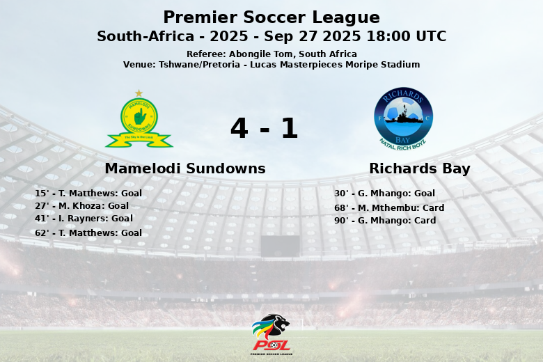T. Matthews a ouvert le score pour l’équipe locale à la 15e minute, suivi par M. Khoza à la 27e minute. Richards Bay a répondu rapidement avec un but de G. Mhango à la 30e minute, mais leur joie fut de courte durée. I. Rayners a étendu l’avance de Mamelodi Sundowns à la 41e minute avec un penalty. En seconde période, T. Matthews a de nouveau marqué à la 62e minute, scellant la victoire des Sundowns.