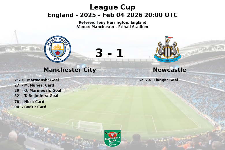 O. Marmoush s’est révélé être un joueur clé, marquant deux buts précoces aux 7e et 29e minutes, ouvrant la voie à la victoire. T. Reijnders a élargi l’avance à la 32e minute. Malgré la domination de City, Newcastle a réussi à réduire l’écart à la 62e minute grâce à un but d’A. Elanga, assisté par M. Thiaw. Cependant, la réponse de City a été solide, maintenant son avance.