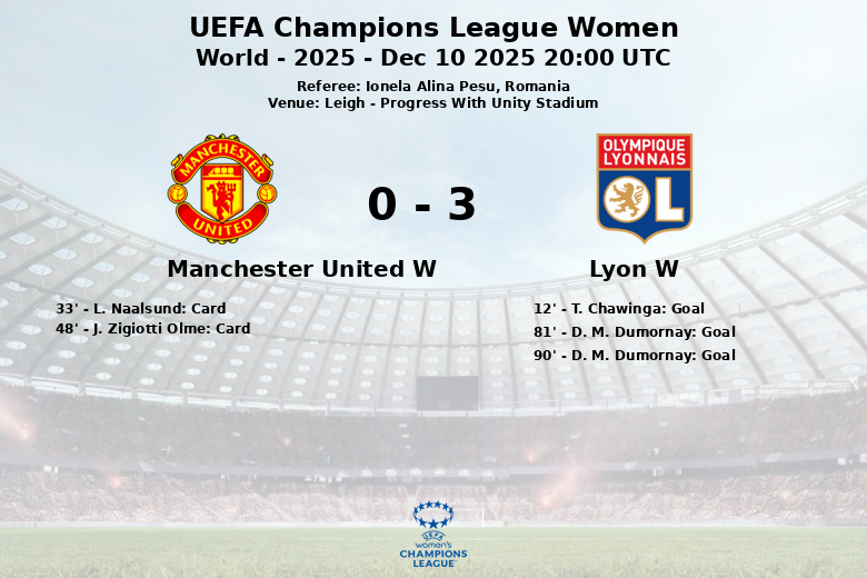 La première mi-temps a vu Lyon prendre l’avantage dès le début avec un but de T. Chawinga à la 12e minute, sur une passe décisive de I. Engen. Manchester United, de son côté, a eu du mal à conserver la possession et à créer du danger, mais sans succès. L. Naalsund a reçu un carton jaune pour United à la 33e minute.