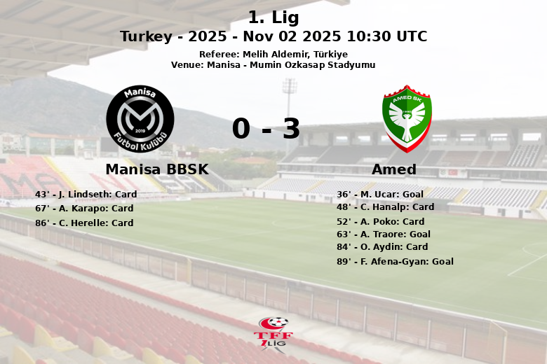 En seconde période, Amed a accru son avance à la 63e minute avec un but d’A. Traore. Le jeu est devenu plus physique, comme en témoignent les cartons jaunes distribués aux joueurs des deux équipes. Finalement, F. Afena-Gyan a scellé la victoire d’Amed à la 89e minute. Le match s’est terminé avec un bilan de 12 tirs pour Amed (5 cadrés) et 9 pour Manisa BBSK (2 cadrés). Manisa a commis 16 fautes et a reçu 3 cartons jaunes, tandis qu’Amed a commis 11 fautes et a également reçu 3 cartons jaunes.