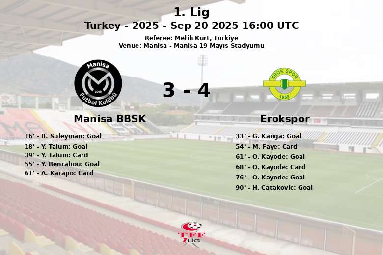 Manisa BBSK a pris l’avantage tôt avec des buts de B. Suleyman et Y. Talum aux 16e et 18e minutes respectivement, ce dernier étant une passe décisive de Suleyman. Cependant, Erokspor a répondu avec un but sur penalty de G. Kanga à la 33e minute. La première mi-temps a également vu un carton jaune pour Y. Talum de Manisa BBSK.