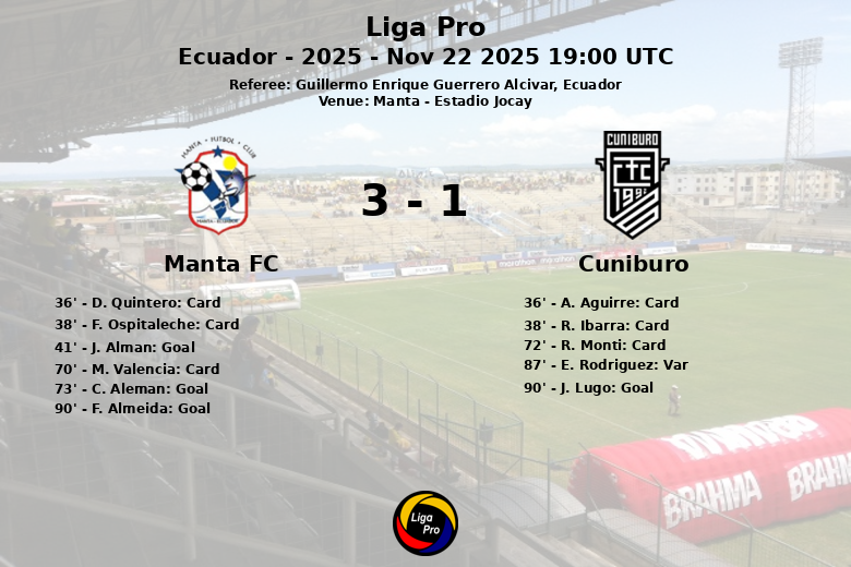 En seconde mi-temps, le match a continué à un rythme effréné. C. Aleman a étendu l’avance de Manta FC à la 73e minute, avec une passe décisive de J. Alman. Cependant, Cuniburo n’a pas abandonné et s’est battu pour réduire l’écart. Un but de E. Rodriguez a été refusé par la VAR à la 87e minute en raison d’une faute précédente. Dans le temps additionnel, J. Lugo a marqué pour Cuniburo sur penalty à la 90e minute. Manta FC a répondu immédiatement : F. Almeida a scellé la victoire avec un but à la 90e minute, assisté par J. Chala.
