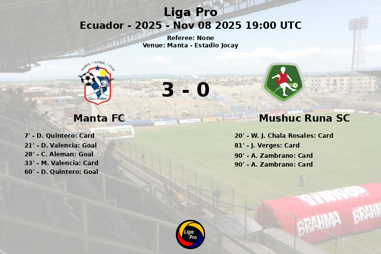 Remplacements dans l’quipe de manta fc: À la 69e minute, D. Valencia est entré et J. Zambrano est sorti., À la 77e minute, M. Valencia est entré et L. B. Torres Nazareno est sorti., À la 77e minute, F. Ospitaleche est entré et F. Almeida est sorti., À la 83e minute, B. Ramirez est entré et D. Cabezas est sorti., À la 83e minute, C. Aleman est entré et J. Mina est sorti.