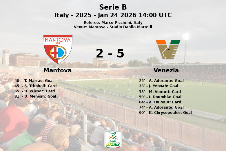 Mantoue n’a pas abandonné, et D. Mensah a marqué à la 81e minute. Un but contre son camp de K. Chrysopoulos à la 90e minute a donné un mince espoir à Mantoue. Malgré l’effort final, cela n’a pas suffi à éviter la défaite. Le match s’est terminé par une pluie de buts et Venise a su profiter de ses occasions, bien que Mantoue ait fait preuve d’un esprit combatif jusqu’à la fin. Marco Piccinini était l’arbitre.