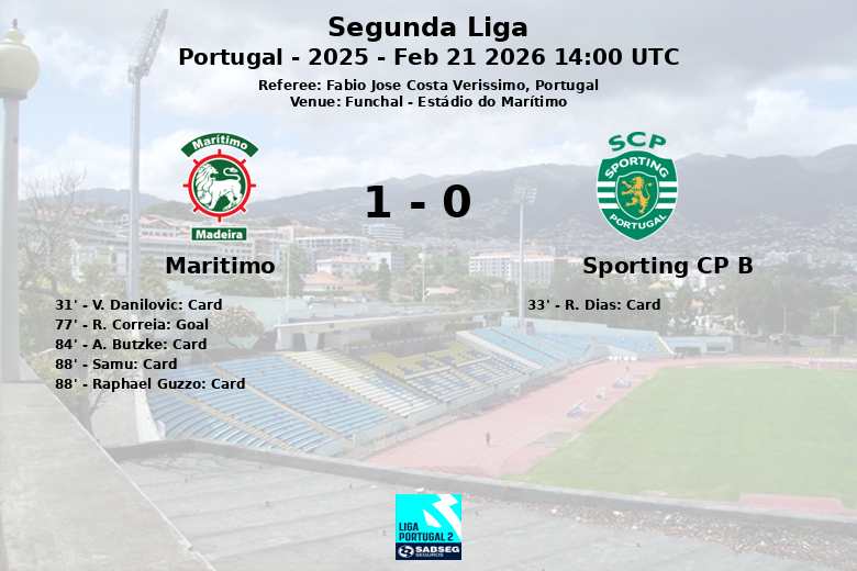 Funchal, Portugal – Dans un match acharné au Estádio do Marítimo, Marítimo a remporté la victoire contre le Sporting CP B lors d’un match correspondant à la 23e journée de la Segunda Liga portugaise. Le match, arbitré par Fabio Jose Costa Verissimo, a été caractérisé par l’intensité et les batailles au milieu de terrain, reflétées par les cinq cartons jaunes distribués au cours du match, quatre pour Marítimo (V. Danilovic, A. Butzke, Samu et Raphael Guzzo) et un pour le Sporting CP B (R. Dias).