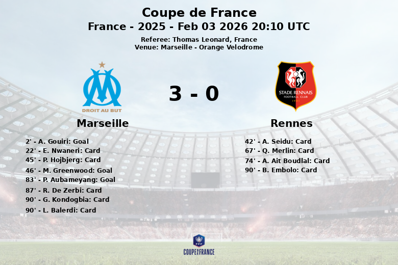 Marseille, le 3 février 2026 – L’Olympique de Marseille a validé sa place en huitièmes de finale de la Coupe de France grâce à une victoire convaincante à domicile contre Rennes à l’Orange Vélodrome. Malgré une légère domination de Rennes en termes de possession (51% contre 49%), Marseille s’est montré plus efficace en attaque, traduisant sa domination en buts.