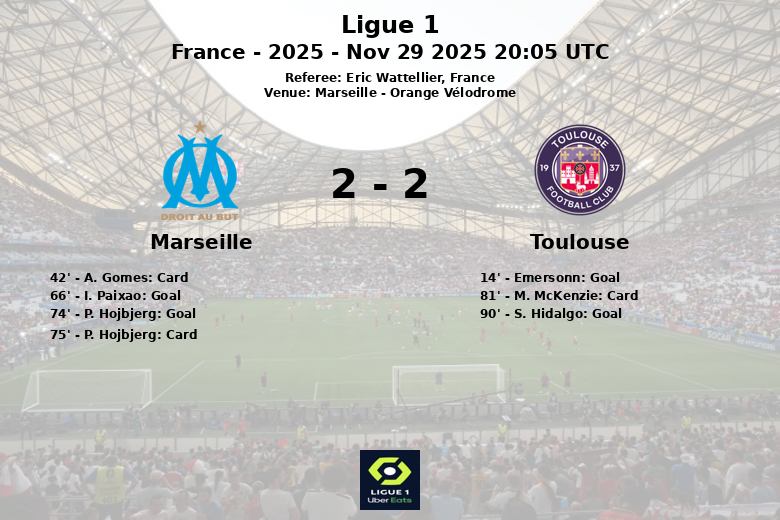 En seconde période, Marseille a réagi et a réussi à renverser le score. I. Paixao a égalisé à la 66e minute, servi par B. Nadir, et plus tard P. Hojbjerg a donné l’avantage aux locaux à la 74e minute, servi par P. Aubameyang. Hojbjerg recevrait également un carton jaune une minute plus tard. Alors qu’il semblait que Marseille allait remporter la victoire, S. Hidalgo de Toulouse a égalisé à la 90e minute, servi par M. McKenzie, scellant un match nul qui laisse un goût doux-amer aux deux équipes. Toulouse, malgré sa faible possession (23 %), s’est montré efficace devant le but et a ramené un point précieux de sa visite à l’Orange Vélodrome. M. McKenzie de Toulouse a également reçu un carton jaune à la 81e minute. Le match s’est terminé sur un score de Marseille 2, Toulouse 2.