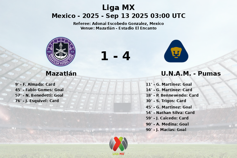 Pumas a pris une avance rapide grâce à un penalty transformé par G. Martinez à la 11e minute. Cependant, le jeu est devenu physique, avec plusieurs cartons jaunes distribués aux deux équipes en première mi-temps. Juste avant la mi-temps, Martínez est réapparu pour étendre l’avance de Pumas avec un but normal, assisté par J. Ruvalcaba. Mazatlán a immédiatement réagi avec un but de Fabio Gomes, assisté par O. F. Moreno Villegas, réduisant ainsi l’écart avant la pause.