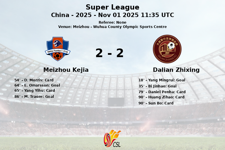 Cependant, Meizhou Kejia a réagi en seconde période. E. Omarsson a marqué à la 64e minute, réduisant l’avantage de Dalian Zhixing. La pression de l’équipe locale s’est poursuivie, et finalement, un but contre son camp de M. Traore à la 86e minute, sur une passe décisive de Rodrigo Henrique, a égalisé le score.