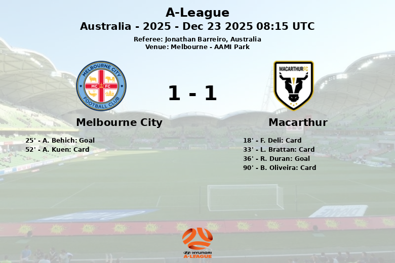 Melbourne, Australie – Dans un match disputé à l’AAMI Park, Melbourne City et Macarthur ont fait match nul 1 à 1 lors d’une rencontre de l’A-League marquée par l’intensité et les cartons. Melbourne City a dominé la possession avec 66%, mais n’a pas réussi à la traduire en victoire. A. Behich a donné l’avantage aux locaux à la 25e minute, mais la joie fut de courte durée car R. Duran a égalisé pour Macarthur à la 36e minute sur une passe décisive de H. Politidis.