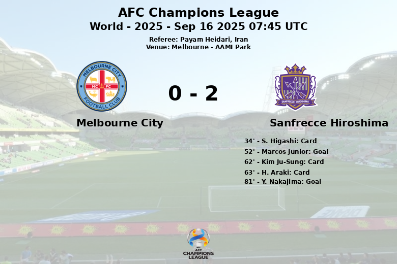 Le score a été ouvert à la 52e minute lorsque Marcos Junior a transformé un penalty en faveur de Sanfrecce Hiroshima. Malgré les tentatives de Melbourne City pour égaliser, la défense japonaise est restée solide. L’avance a été étendue à la 81e minute, grâce à un but de Y. Nakajima, sur une passe de S. Nakano. Le match s’est terminé sur le score suivant: Sanfrecce Hiroshima 2 – Melbourne City 0. Le match a été marqué par l’intensité, avec un total de 20 fautes commises (10 par équipe) et trois cartons jaunes pour Sanfrecce Hiroshima. Melbourne City, en revanche, n’a reçu aucun avertissement.